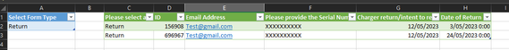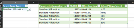 If I was to select an option in the list, say for example "Return" I want to generate a table with 6 Columns. However, if I selected "Standard Allocation" I want 4 different columns. All the data is retrieved from a table called "Data_Dump" that gets update every time a MS Form is filled out. Below are some images that illustrate this idea.