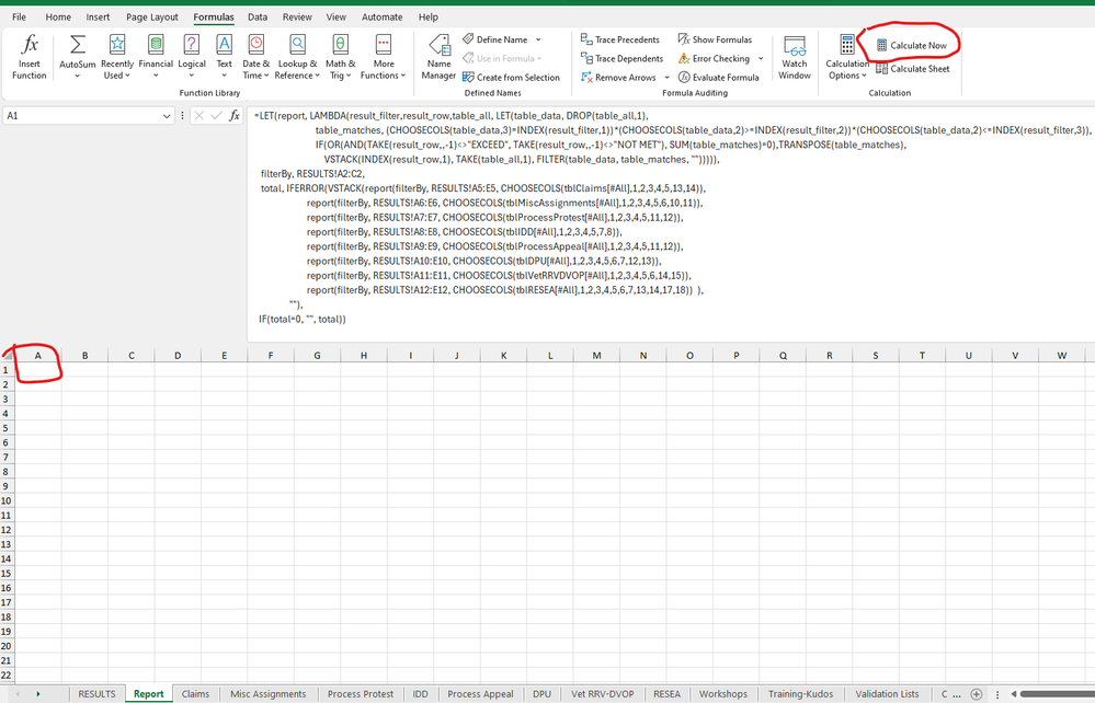 =LET(report, LAMBDA(result_filter,result_row,table_all, LET(table_data, DROP(table_all,1), table_matches, (CHOOSECOLS(table_data,3)=INDEX(result_filter,1))*(CHOOSECOLS(table_data,2)>=INDEX(result_filter,2))*(CHOOSECOLS(table_data,2)<=INDEX(result_filter,3)), IF(OR(AND(TAKE(result_row,,-1)<>"EXCEED", TAKE(result_row,,-1)<>"NOT MET"), SUM(table_matches)=0),"", VSTACK(INDEX(result_row,1), TAKE(table_all,1), FILTER(table_data, table_matches, ""))))), filterBy, RESULTS!A2:C2, total, IFERROR(VSTACK(report(filterBy, RESULTS!A5:E5, CHOOSECOLS(tblClaims[#All],1,2,3,4,5,14)), report(filterBy, RESULTS!A6:E6, CHOOSECOLS(tblMiscAssignments[#All],1,2,3,4,5,6,11)), report(filterBy, RESULTS!A7:E7, CHOOSECOLS(tblProcessProtest[#All],1,2,3,4,5,12)), report(filterBy, RESULTS!A8:E8, CHOOSECOLS(tblIDD[#All],1,2,3,4,5,8)), report(filterBy, RESULTS!A9:E9, CHOOSECOLS(tblProcessAppeal[#All],1,2,3,4,5,12)), report(filterBy, RESULTS!A10:E10, CHOOSECOLS(tblDPU[#All],1,2,3,4,5,6,7,13)), report(filterBy, RESULTS!A11:E11, CHOOSECOLS(tblVetRRVDVOP[#All],1,2,3,4,5,6,15)), report(filterBy, RESULTS!A12:E12, CHOOSECOLS(tblRESEA[#All],1,2,3,4,5,6,7,18)) ), ""), IF(total=0, "", total))so now each table/row of the results is passed to the LAMBDA so you just need to tweak those rows 6-13. I did a first guess at which are the right columns you want in the CHOOSECOLS but I hope you can get the idea and tweak this a little easier.