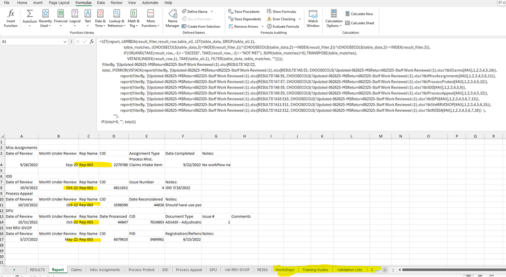 The RESULTS tab wasn't changed at all. Everything was already built on that tab when I sent it for help with the Report tab. All I did to make the dummy file was to change the staff names on the 'Validation Lists' tab to Rep001, 002 etc. and then remove the majority of the records from each review tab.