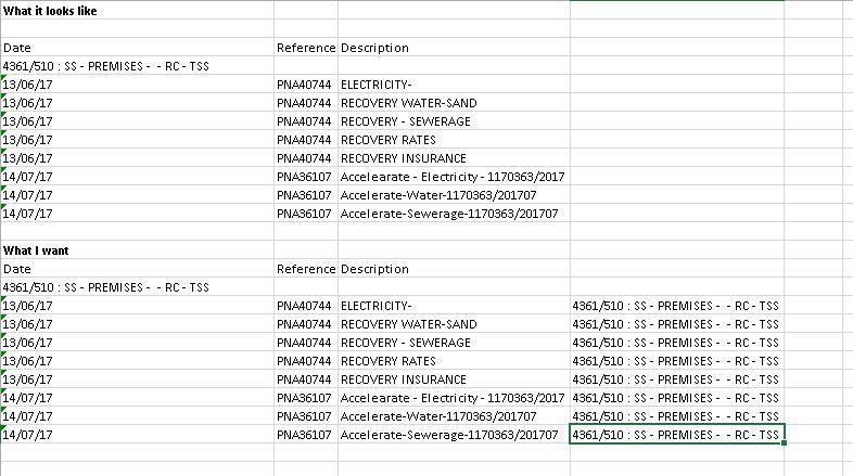 I have an export from my accounting software for all my transactions for the year. Each account will have a heading with the unique account number and then all the accounts will then show below. I want a formula that will copy the heading to a column in each row. I don't want to do it manually as it is thousands of lines.