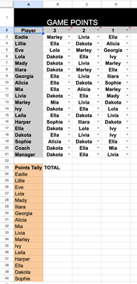 Eg; Calculate points for Eadie in B24 across ALL tabs (game) to go into cell B4 in the TOTAL tab (for all players). And how would I adjust the formula each week I add a new game Tab?