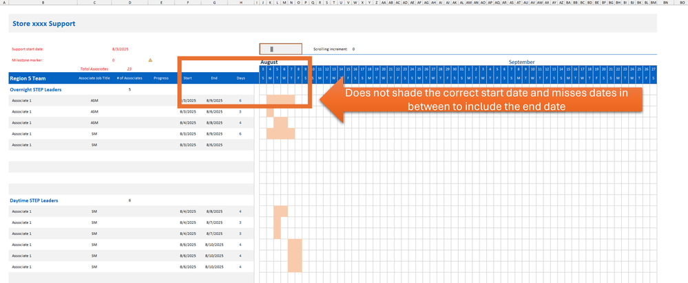I'm currently working on a Gantt chart to track how long each person will be in the store. However, I've noticed that the number of days isn't calculating correctly. I'm trying to capture the full duration for each person, but something seems to be off in the formula or setup.