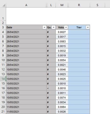 =IF(M4>=0.1, "Tier 3", IF(M4>0.01, "Tier 2", IF(M4<0.01, "Tier 1", IF(L4="#", "Tier 2", "Tier 1"))))