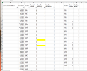 I am trying to create a spreadsheet to track allowed vacation time for employees. I would like column F to contain a formula that will return the correct number of vacation days for an individual emp...