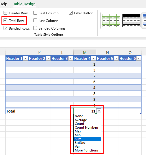 You can add a Total row to the table and specify Sum as summary function.