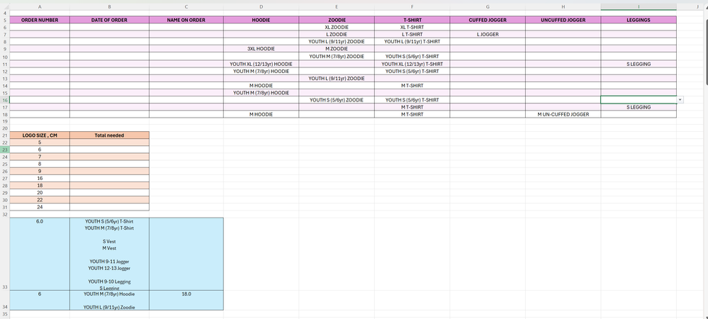 I would therefore like excel to look at the purple table and see that there are 3 x 'Youth S T-shirt', 2 x S Legging and 2 x Youth M Hoodie, therefore 7 items require a 6cm logo, so I would like excel to populate the orange table in the 'total needed' column for 6cm (cell B23) to show '7'.