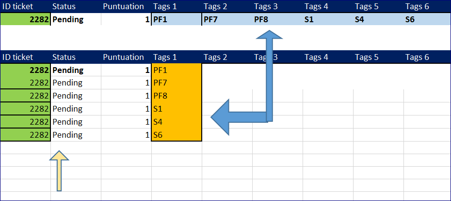 2. Second, how can I do to transpose and the same time fille every row with the respective ID , status, puntuation , (2282) as I show you in green color