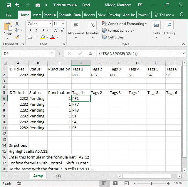 1. First I want to take the blue horizontal cells (PF7,PF8, S1, S4 and S6) and transpose it to vertical as I show you with orange color