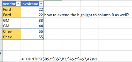 hello, I have a conditional formatting with a countif formula =COUNTIFS($B$2:$B$7,B2,$A$2:$A$7,A2)>1 it correctly highlights but I want to extend the highlight to column B as well. It currentl...