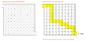 As for this particular problem of the maze, it is not the problem I would have picked to demonstrate the benefits of the approach; I picked it because the two internal references to elements of the same array makes the problem inherently difficult for array methods. That said, once I had the solution process as a function, Solveλ(grid), I was able to rotate the grid through 180 and re-solve effortlessly, so allowing me to test each cell to determine whether it is on a critical path or not.