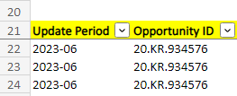 Hi all, I would like to get first row of text every time I filter row. e.g. when Update Period selected 2023-06, then capture the first row# 22. when Update Period selected 2023-07, then ca...