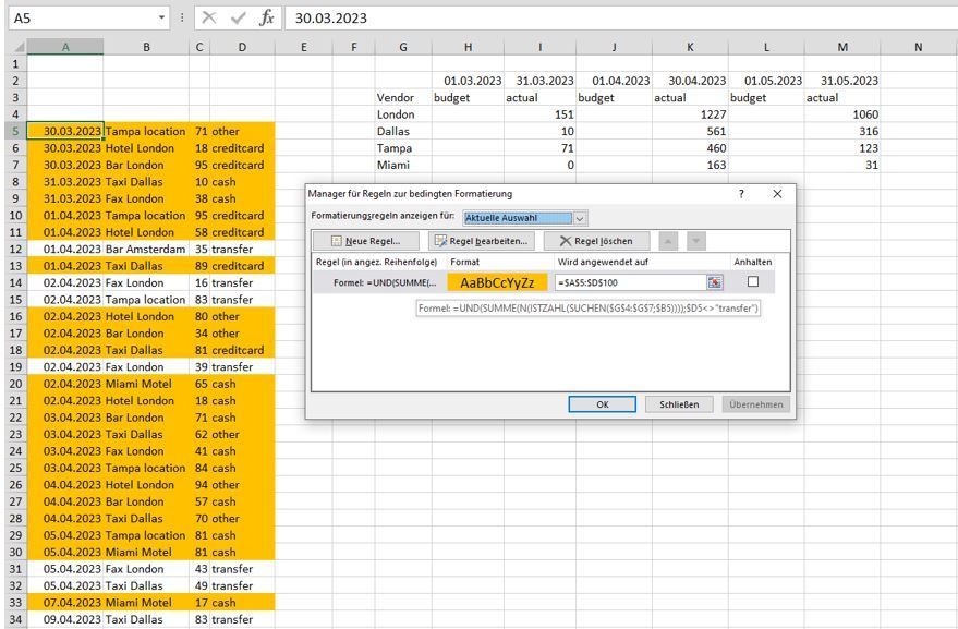 =AND(SUM(N(ISNUMBER(SEARCH($G$4:$G$7,$B5)))),$D5<>"transfer")This is the rule for conditional formatting in the example. If there are more vendors (4 in the example) than you have to adapt the range in the rule for conditional formatting from $G$4:$G$7 to e.g $G$4:$G$25.