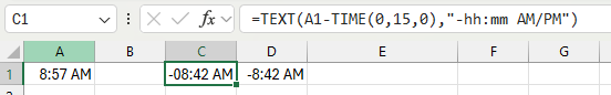=TEXT(A1-TIME(0,15,0),"-hh:mm AM/PM")To make it conditional you can use IF() or IFS() function.
