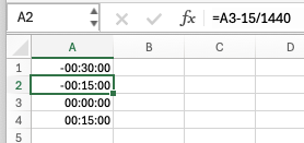 I'm trying to create an Excel spreadsheet with a column that shows the time relative to a predetermined point in time in 15-minute intervals with negative values for time in the cells above 0:00 and positive values below. I have the correct formulas entered in, but I can't seem to figure out how to get Excel to display negative values for time. Is there a way to do this?