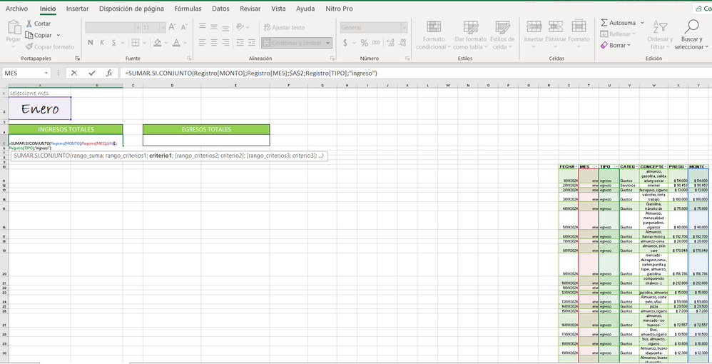 =SUMAR.SI.CONJUNTO(Registro[MONTO];Registro[MES];IZQUIERDA($A$2;3);Registro[TIPO];"ingreso")