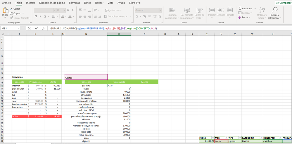 =SUMAR.SI.CONJUNTO(registro[PRESUPUESTO];registro[MES];$B$2;registro[CONCEPTO];N14)