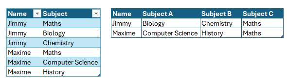 let Source = Excel.CurrentWorkbook(){[Name="Students"]}[Content], GroupNames = Table.Group( Source, {"Name"}, { {"Subject", each List.Sort( [Subject] )} }), SubjectNames = List.Transform( {1..List.Max( Table.TransformColumns( GroupNames, {"Subject", (q) => List.Count(q)} )[Subject] )}, (e) => "Subject " & Character.FromNumber(e+64) ), ExtractSubjects = Table.TransformColumns( GroupNames, {"Subject", each Text.Combine(List.Transform(_, Text.From), ","), type text} ), SplitSubjects = Table.SplitColumn( ExtractSubjects, "Subject", Splitter.SplitTextByDelimiter(",", QuoteStyle.Csv), SubjectNames) in SplitSubjectsPlease check attached.