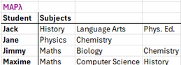 =LET( student, UNIQUE(Name), SubjectListλ, LAMBDA(n, TOROW(FILTER(Subject, Name = n))), subjectList, MAPλ(student, SubjectListλ), SORT(HSTACK(student, subjectList)) )The first line creates a list of distinct student names. The second line defines a function that will return a list of subjects for any given student. The third line uses MAP to return the subject list for each student in turn. This is where the Excel in-built functionality fails. What I have done instead is use a function MAPλ that I wrote to overcome the problem. The final line sorts the data alphabetically by student name, to give