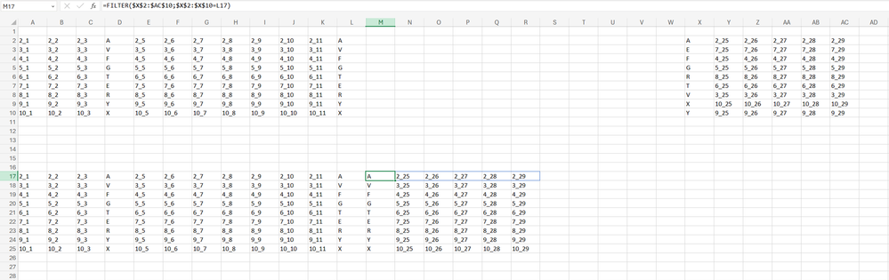 =FILTER($X$2:$AC$10,$X$2:$X$10=L17)