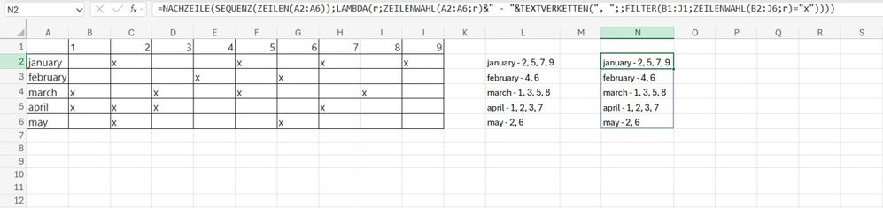 =LET(arr,LAMBDA(x,CHOOSE(x,A2:A6,SEQUENCE(ROWS(B2:H6)))), MAP(arr({1}),arr({2}),LAMBDA(a,b,a&" - "&TEXTJOIN(", ",,FILTER(B1:J1,CHOOSEROWS(B2:J6,b)="x")))))=BYROW(SEQUENCE(ROWS(A2:A6)),LAMBDA(r,CHOOSEROWS(A2:A6,r)&" - "&TEXTJOIN(", ",,FILTER(B1:J1,CHOOSEROWS(B2:J6,r)="x"))))These formulas return the expected result if i correctly understand what you are looking for.