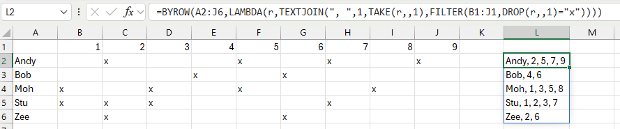 =BYROW(A2:J6,LAMBDA(r,TEXTJOIN(", ",1,TAKE(r,,1),FILTER(B1:J1,DROP(r,,1)="x")))) - OliverScheurichGold Contributor