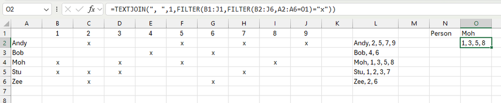 =TEXTJOIN(", ",1,FILTER(B1:J1,FILTER(B2:J6,A2:A6=O1)="x"))If you want result row wise then could try-