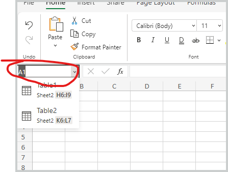 - JKPieterseSilver ContributorIf I click in the Name box (to the left of the formula bar) I can see all table sin my workbook and select the one to go to.