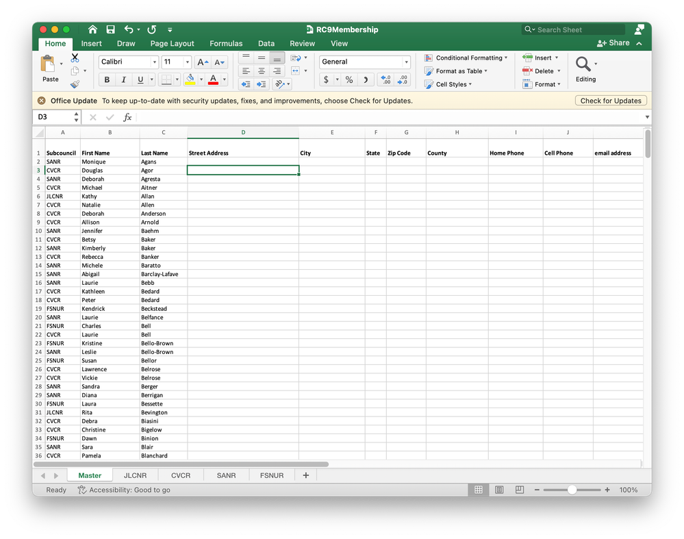 I work with a group of retired teachers in Northern New York. We have a master list, but would like to generate separate lists (tabs) based on counties (sub-councils) of residence.