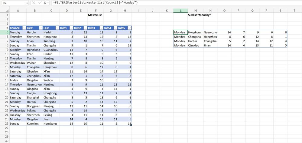 =FILTER(Masterlist,Masterlist[Council]="Monday")I'd turn the Masterlist into a dynamic table and apply the FILTER function in the subsheets. I can't attach a sample file therefore i've added a screenshot that shows the result within the same sheet. The formula works across sheets as well. If you don't have access to the FILTER function i can suggest a solution that works in legacy Excel such as Excel 2013.
