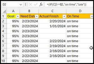 - The nested IF function then checks if the "Actual Finish" date (C2) is less than or equal to the "Planned Finish" date (B2). If it is, it returns "on time". Otherwise, it returns "late".