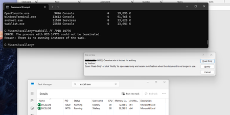 If killing the process isn’t working, logging out of Windows and back in will usually clear the Excel lock without requiring a full restart.