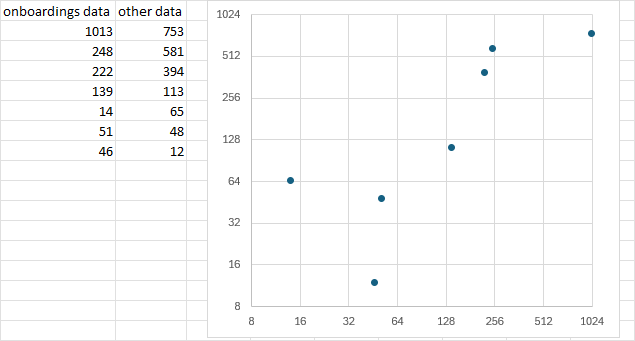 Here is an example of a chart using the actual values, but with logarithmic axes.