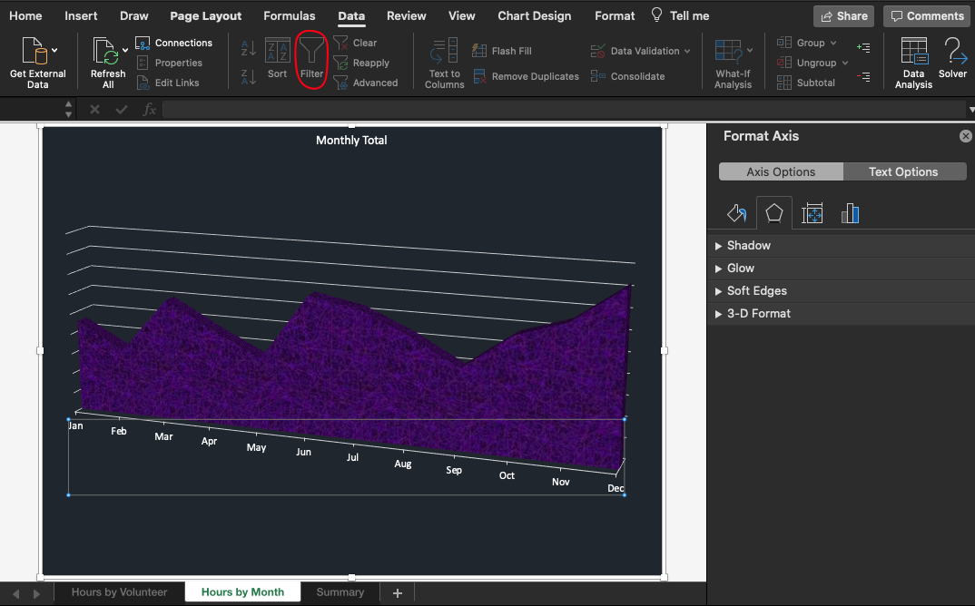 I am trying to filter data on the x-axis of a graph in Excel for mac but the filter button is greyed out. I've read in old forums that Microsoft hasn't made this feature usable. Is it not possible other than refinding the range needed? I need to change the range from Jan-Dec to June-Dec