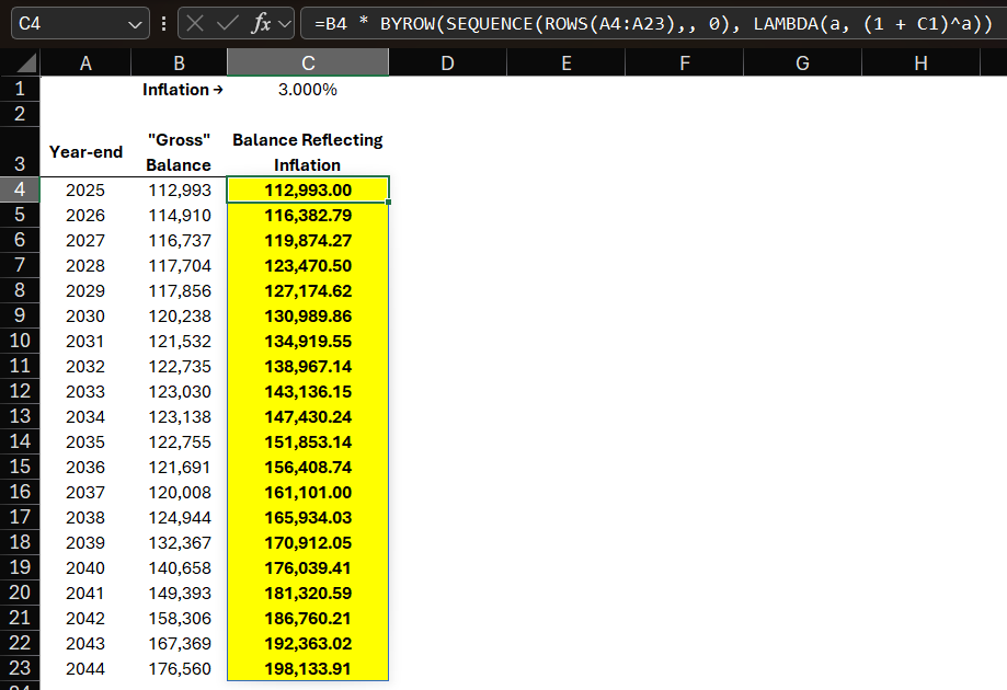So maybe what I should be doing is simply comparing the year-end balance of the account to what the 2025 balance will be worth in the future, given inflation (3% in my example).