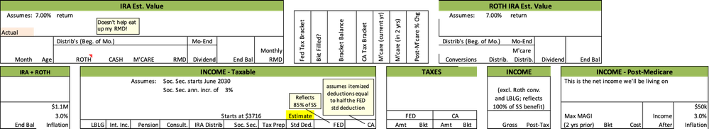 You and I think very much alike. Below are the column headers of the worksheet I am working on. I've included most of the items you mention - IRA projected growth, distributions, conversions, taxes, etc. It calculates my taxes based each income source and projected changes in the Fed and CA tax brackets and deductions, Medicare premiums based on those brackets (and projections), and Social Security based on a growth projection.