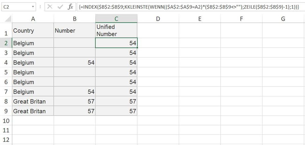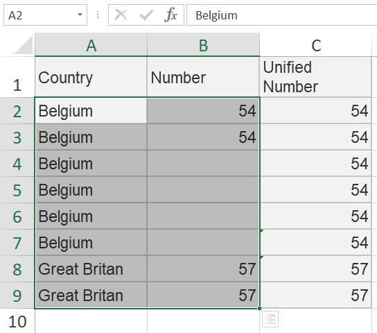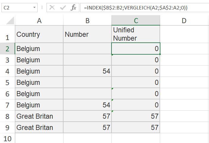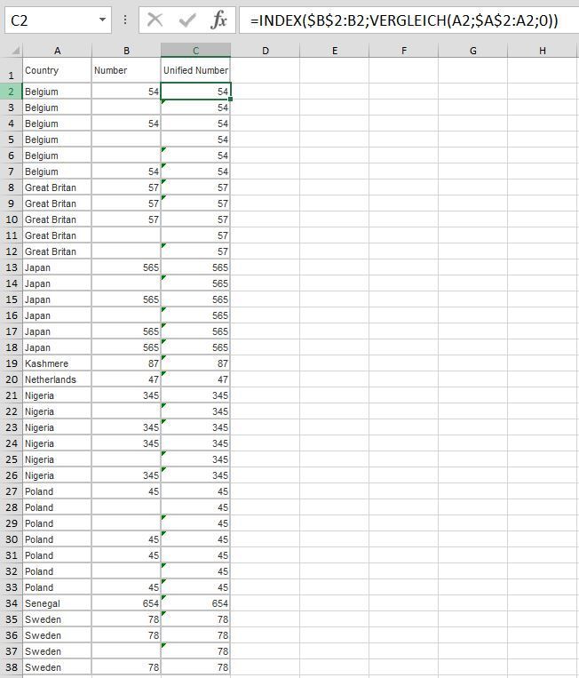Problem statement: every country has a unique number assigned in this table. But not every duplicate value is sharing this number. How can I match this unique number to every group of duplicates? For example, for every "Belgium" value in the Country find non empty cell and match with all "Belgium" values (in the Unified Number column). How to do it without VBA?