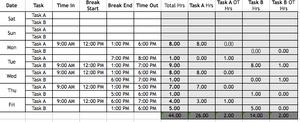 The idea is that you look at In, Start break, End break and Out for each task separately. For instance, on Friday, Task A started 9AM with a break from 12PM until 6PM and then one more hour until 7PM. Task B started 1PM with no breaks to end 6PM. The Over-time formula for weekdays are not straight-forward, though, I believe that they are easier to comprehend than what you described above.