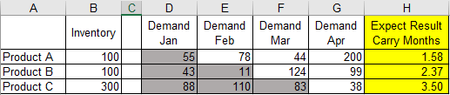 Hi friends, If anyone knows how to calculate carry months by Excel? Take below for example: "Product A" current stock is 100, and I can use 1.58 months after. "Product B" current stock is 1...