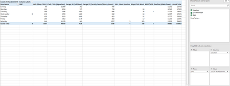 Hello, I have a large data set that includes the location a visitor was checked in at, the date and time of check in and Day of the Week column. I am trying to figure out the Average of visitor c...