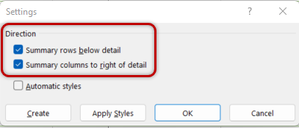Hello, is there a way to change the default Direction Summary settings in the Group/Ungroup feature? My preference 99.9% of the time is to have the toggles at the top and left of row and column group...