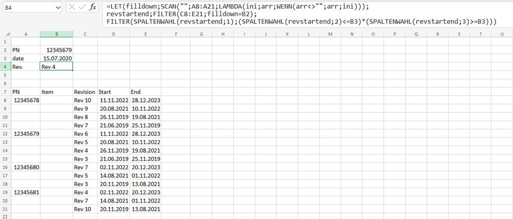 = LET( inDate?, BYROW(dateRange<built, XORλ), filled, SCAN("", partNo, FILLDOWNλ), validParts, IF(inDate?, filled), XLOOKUP(part, validParts, revision, "Not available") )where