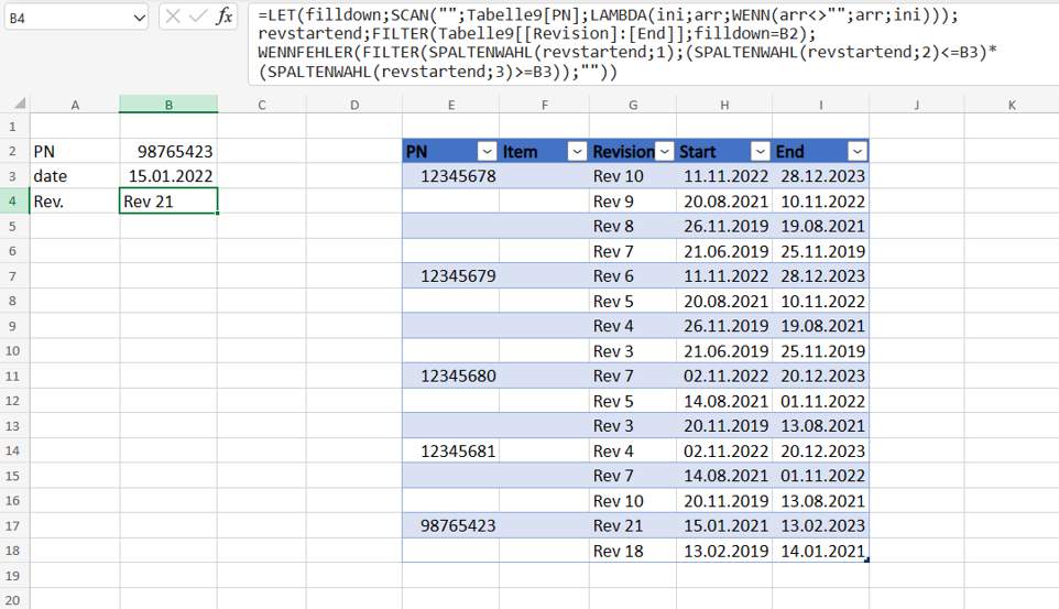 IFERROR(FILTER(CHOOSECOLS(revstartend,1),(CHOOSECOLS(revstartend,2)<=B3)*(CHOOSECOLS(revstartend,3)>=B3)),""))You can work with a dynamic table. Tabelle9[PN] and Tabelle9[[Revision]:[End]] dynamically refer to the actual size of the dynamic table. Tabelle9 is the name of the dynamic table in my example. You have to replace Tabelle9 with the name of your dynamic table.