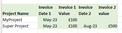 Hi I have a list of projects, with an invoice date, and an invoice value. I pivot these with the project name up the side, and the dates as months along the top, with the invoice values in the Va...