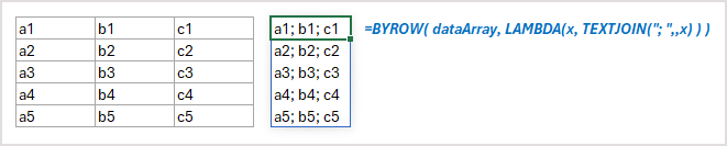 =LET( r, COUNTA(TAKE(MyRange, , 1)), dynamic, TAKE(MyRange, r), Join, LAMBDA(row, TEXTJOIN(";", , row)), BYROW(dynamic, Join) ) - PeterBartholomew1Silver Contributor