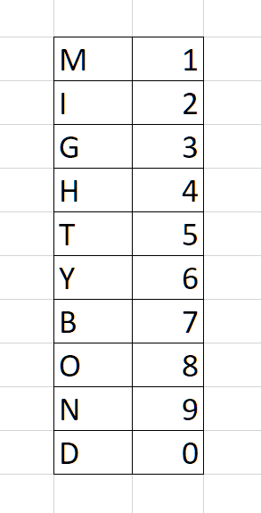 I am looking for a way to assign a letter to a specific number digit. Example: And the number to be converted is 4563 The converted number should then look; HTYG I am looking for a...