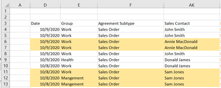Here's a very small subset of my data. Names were changed. I'm trying to copy the rows that match certain names in column E to another spreadsheet (DailyRptB.xlsx). I'm really only concerned with matching on names, not numbers. For simplicity sake say Terri cooper, Barbara, Connie, JC Frank names are the rows I want to MATCH and FILTER on. Whatever FILTER criteria I use, tomorrow the column values may not have Terri, Barbra etc. but have Yuri, Tiffany, Marc (who also comprise my unique group of Sales people).
