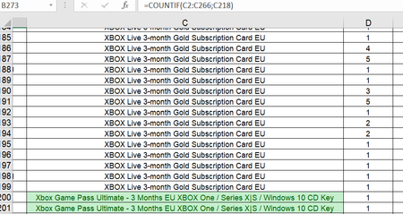 Hey, help please. How I can count, how many pcs were sold together? I can do =countif(C185:C201;C199) to get the number of sold product without the D column, which are number of pcs. I need th...