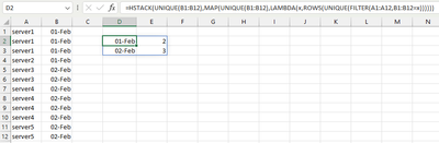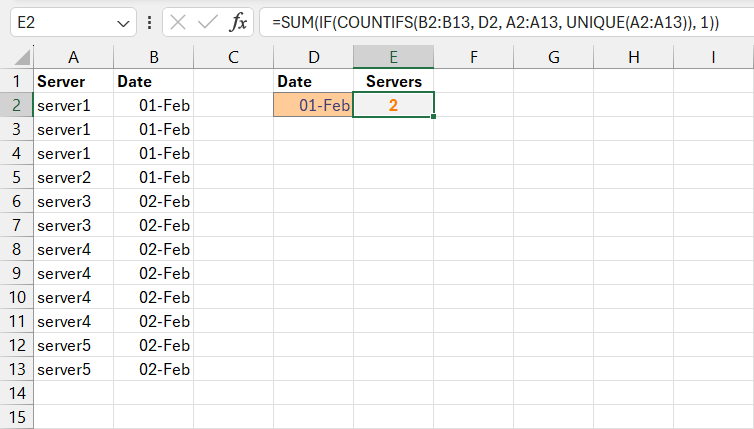 JennyMarfell-Jones To return a distinct count of server names for a specified date, the SUM / COUNTIFS method can be used with the UNIQUE function (Excel 2021 or later). For example, if the input cell for the specified date is cell D2, the following formula can be used: