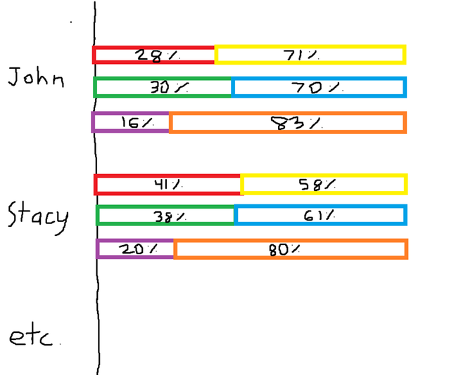 I would like to create a multi-tiered percentage-based bar chart based on the data found below (test data evidently). Column B and C add up to 100%, Column D and E add up to 100%, and lastly column F and G add up to 100%. I would like each set of variables to equate to 100% on the graph, as the source data is percentage based anyways, but all be organized in their own separate row on the graph underneath the employee name. I have included a diagram drawn in MS paint to portray the desired output (with an accompanying legend). Thanks in advance!