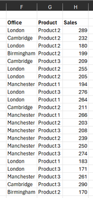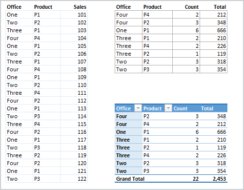 I agree - I guess the biggest issue is getting the unique list by Product and Office, if they were individual columns the SUMIFS/COUNTIFS would be simple.- PeterBartholomew1Silver Contributor